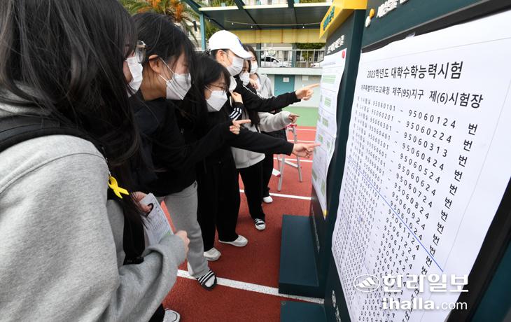 2023학년도 수능 예비소집일인 16일 오전 서울 중구 이화여고에서 수험생들이 시험실을 확인하고 있다. 교육청에서 접수한 학생들은 신분증. 올해 수험생 50만 8030명으로 작년보다 1791명 04.